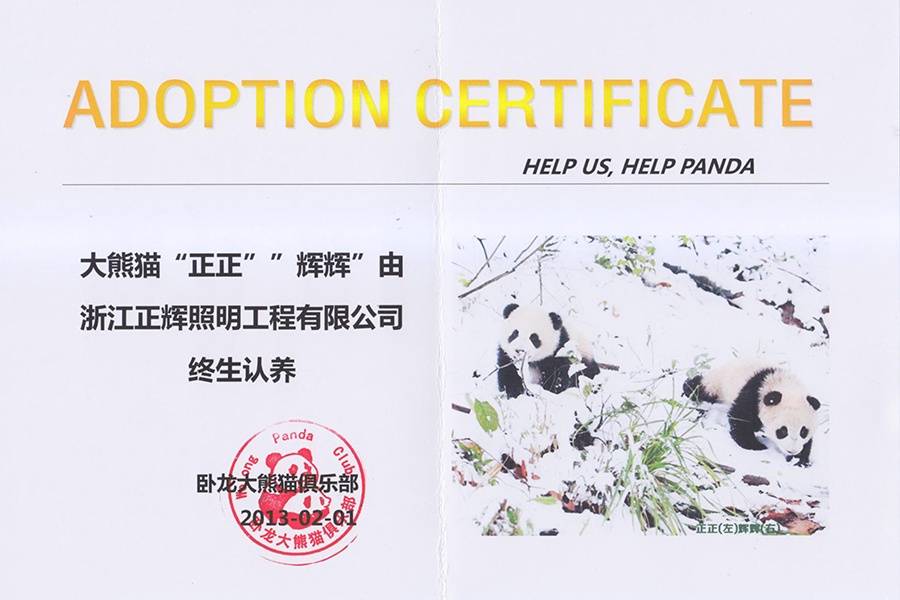 正輝公司終生認養(yǎng)兩只大熊貓 取名:正正、輝輝,正輝公司致力于綠色照明, 倡導節(jié)能環(huán)保對環(huán)境的關愛。 2013年,正輝公司與中國保護大熊貓 研究中心臥龍大熊貓俱樂部達成協(xié)議, 正輝公司終生認養(yǎng)兩只大熊貓, 它們分別命名為正正、輝輝, 展現(xiàn)了我們企業(yè)的社會責任和 在環(huán)境保護方面所做的努力。